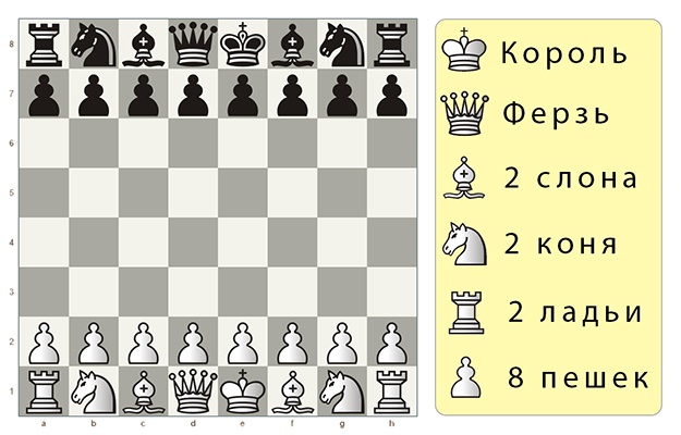 В шахматах всего 6 видов фигур: король, ферзь (иногда называют “королевой”, но это не совсем корректно), слон (опять же в любительском жаргоне встречается название “офицер”), конь, ладья (редко можно услышать устаревшее “тура”) и пешка. Однако количество каждого типа фигур разное. Рассмотрим набор фигур в начальной позиции: