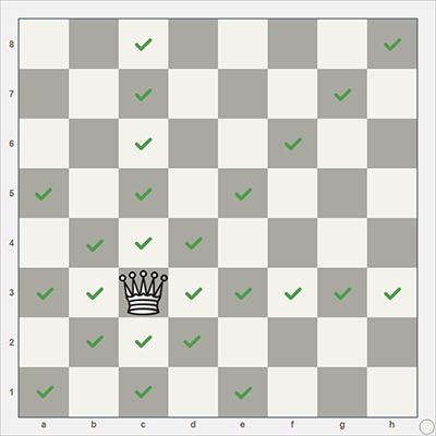 ферзь ходит в любом направлении (по горизонтали, вертикали, диагонали) на любое количество клеток;
