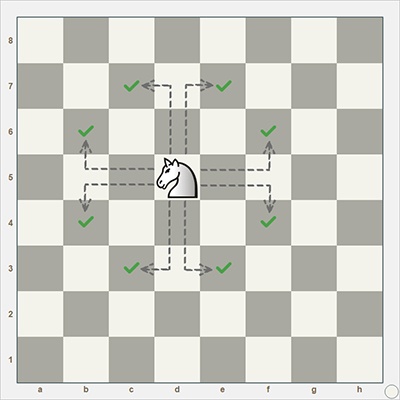 конь ходит в любом направлении “буквой Г”: на три клетки по горизонтали или вертикали, а затем поворот на 90° и еще на одну клетку (траекторию хода проще показать на картинке — см. далее);
