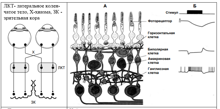 В сетчатке (в ее нервных клетках) происходит сложнейшая обработка первичной зрительной информации, ее кодирование. Представленная в таком виде (импульсами) информация передается в мозг. При нормальном состоянии сетчатки так работает глаз. При изменении состояния сетчатки (при заболевании) при разрушении и гибели клеток светочувствительного слоя, наступает слепота.