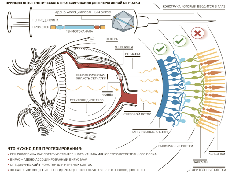 Используется безвредный для организма вирус, которому отводится роль транспорта. На него навешивается ген родопсина и еще элемент, который заставляет этот ген прийти по конкретному адресу — в нервные клетки. И когда на них попадает свет, они выдают импульсы, которые идут в мозг. Глаз при этом чувствует попадающий в него свет и реагирует импульсами.
