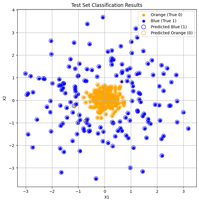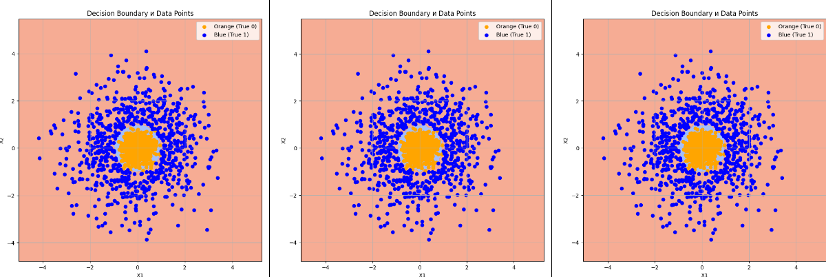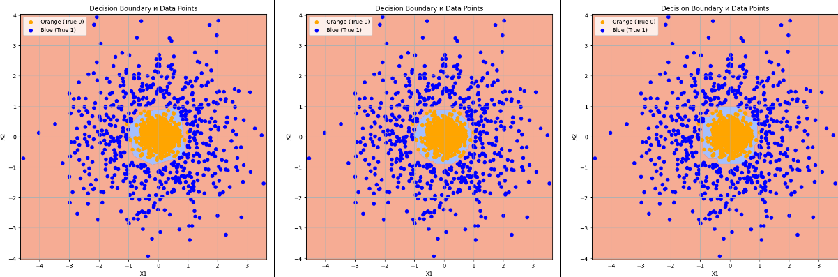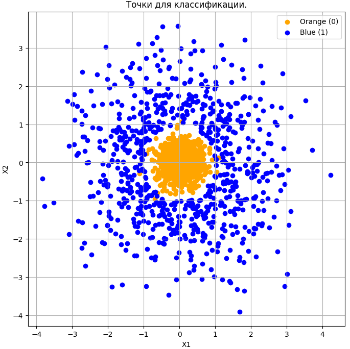 Сепарабельные данные должны иметь расстояние между классами, чтобы данные классифицировались тремя нейронами. На рисунке выше видно что между группами оранжевых и синих точек есть кольцевой зазор. В моем случае, зазора нет (рисунок будет ниже) и нужно минимум – 6 нейронов (см. код в Google Colab по ссылке ниже). Это требование к количеству нейронов возникает из-за того что классы прилегают плотно друг-к-другу и “зазор” между голубыми и оранжевыми метками в моем наборе небольшой (его почти нет). Если, в секции генерации данных, сделать вместо: