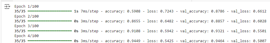 history = model.fit(X_train, y_train, epochs=100, batch_size=32, validation_split=0.2)