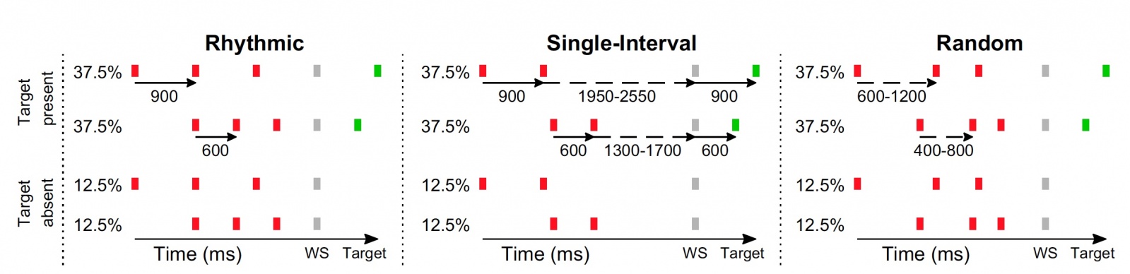 Схематическое изображение трех вариантов опытов: ритмический, одноинтервальный и случайный.