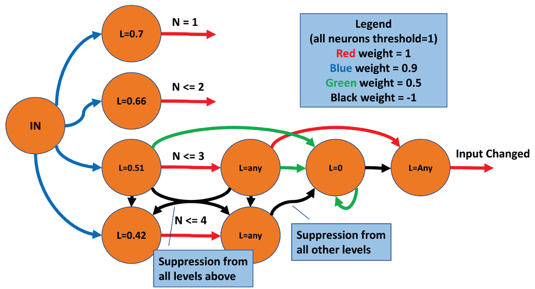 Схема выше преобразует последовательный сигнал в параллельный набор каналов, каждый из которых соответствует определенной входной частоте. Нейрон «Input Changed» для каждого детектируемого уровня будет выдавать один спайк только при обнаружении заданного уровня. Если рассматриваемый сигнал исходил от фоторецептора палочки сечатки, чувствительного к интенсивности монохромного света, каждый из различаемых параллельных сигналов представлял бы определенный уровень серого в рассматриваемой точке.
