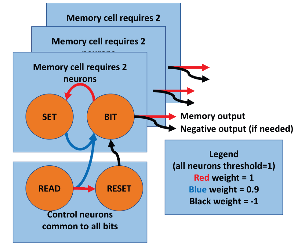 Механизм памяти, показанный на рисунке, состоит из двух нейронов на каждый бит памяти плюс два управляющих нейрона, общих для всех битов. Информация хранится на уровне внутреннего заряда нейрона BIT. Если нейрон SET срабатывает, он передает подпороговый заряд нейрону BIT, хранящему логическую единицу. Если сработает нейрон READ, сработает любой нейрон BIT с зарядом больше 0,1, генерируя выходной ответ. Одновременно он будет повторно стимулировать соответствующий нейрон SET, чтобы восстановить частичный заряд в нейроне BIT. Активация нейрона RESET сбросит заряд всех нейронов BIT.