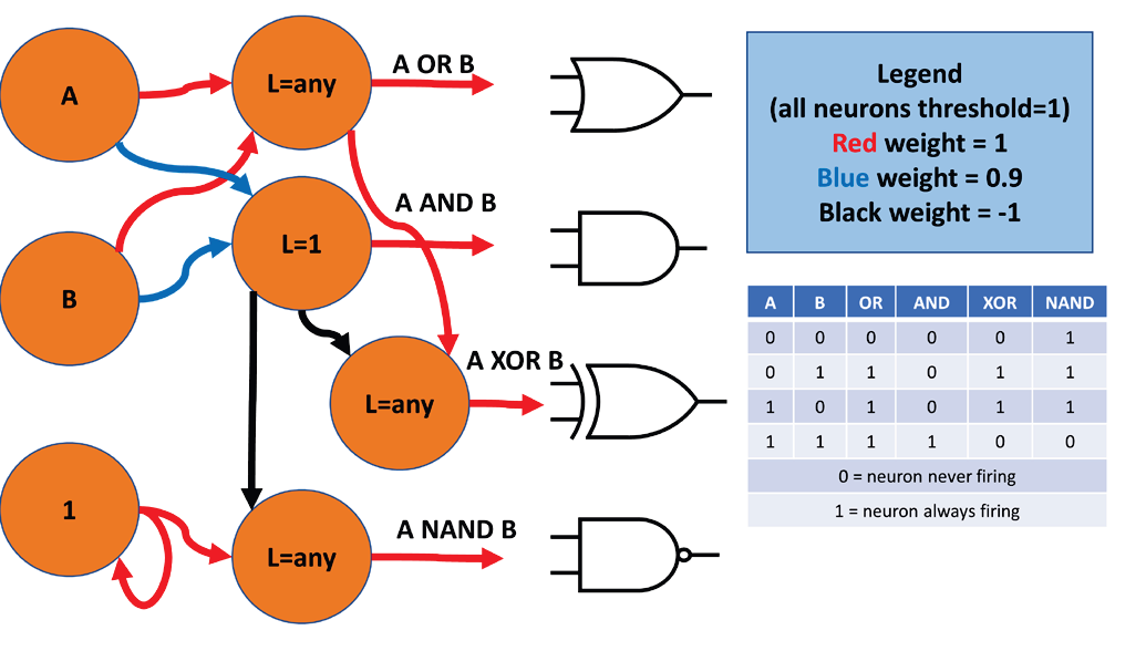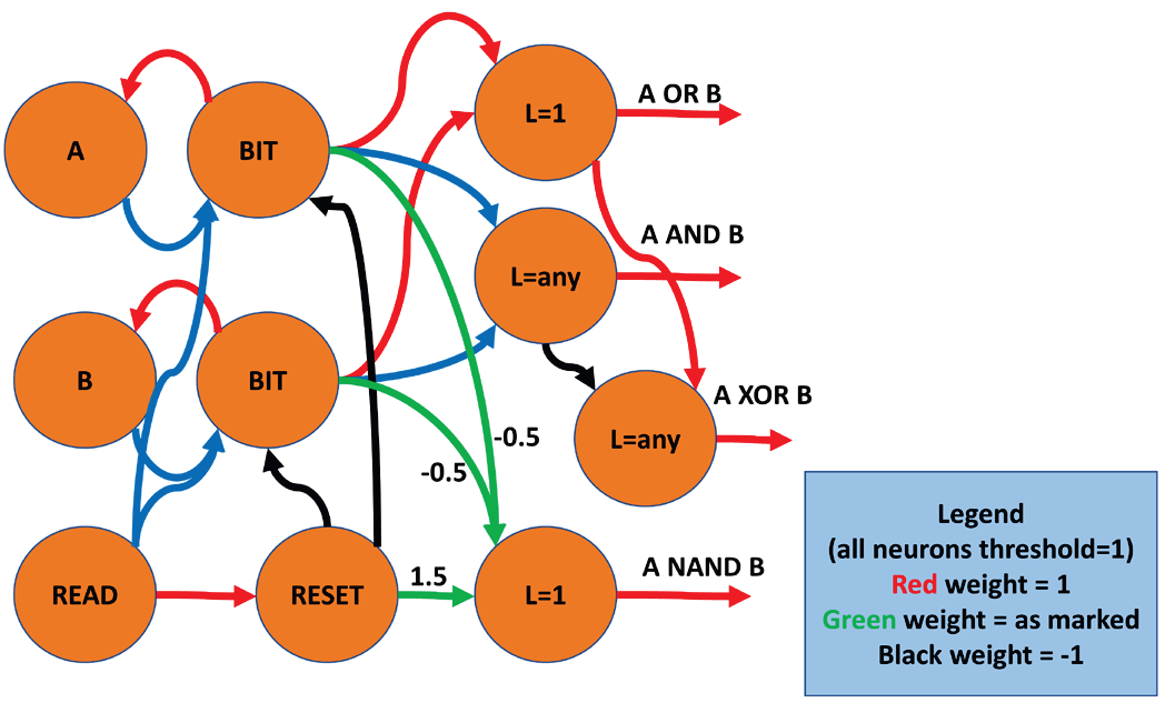 На рисунке показан вариант логической схемы, который может выполнять функции логических элементов с гораздо меньшими энергетическими затратами. Кратковременная память на входе означает, что входы A и B могут поступать асинхронно. Когда срабатывает нейрон READ, различные выходные сигналы будут выдавать один спайк (или нет в зависимости от ситуации). В остальное время нейроны не срабатывают.