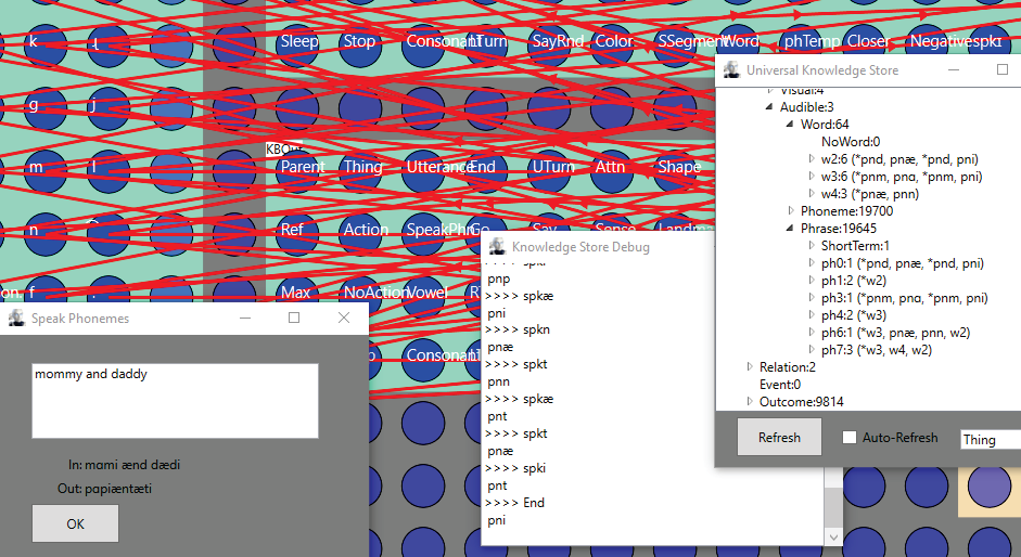 UKS взаимодействует с внешней схемой с массивами входных и выходных нейронов точно так же, как Нейронный Граф. В UKS управляющие синапсы нейронного графа заменены несколькими строками кода. Приложение UKS, изображенное на рисунке ниже, использует узлы для представления фонем, слов и фраз. Как и в нейронном графе, в UKS не хранятся никакие данные, а узлам присваиваются произвольные метки, за исключением тех, которые связаны с известными входами и выходами. Как показано на рисунке, фраза ph7 состоит из слов w3, w4 и w2 (именно в таком порядке). Слова связаны с фонемами, которые, в свою очередь, связаны с речевым движком. Приложение получает непрерывные потоки фонем и может определять слова и фразы с повторением.
