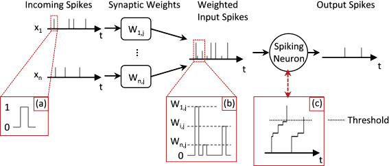 С точки зрения компьютерного проектирования можно увидеть, что входящие сигналы должны быть преобразованы в спайковые сигналы как можно раньше, вся обработка должна выполняться на параллельных одиночных импульсах, а выходные данные должны быть преобразованы обратно непосредственно перед выводом результата вычислений.