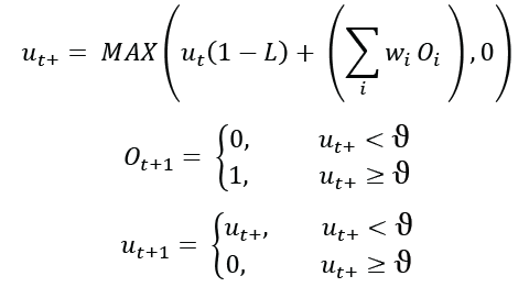 Где ut — потенциал мембраны нейрона в момент времени t. ut+ — промежуточное значение. L – скорость утечки, диапазон от 0 до 1. ?? — это входящие синаптические сигналы от других нейронов, равные 1 или 0. ??, синаптический вес, может иметь любое значение, но обычно находится в диапазоне от -1 до 1. Порог ϑ имеет определенное значение 1, при этом все остальные значения масштабируются соответствующим образом.