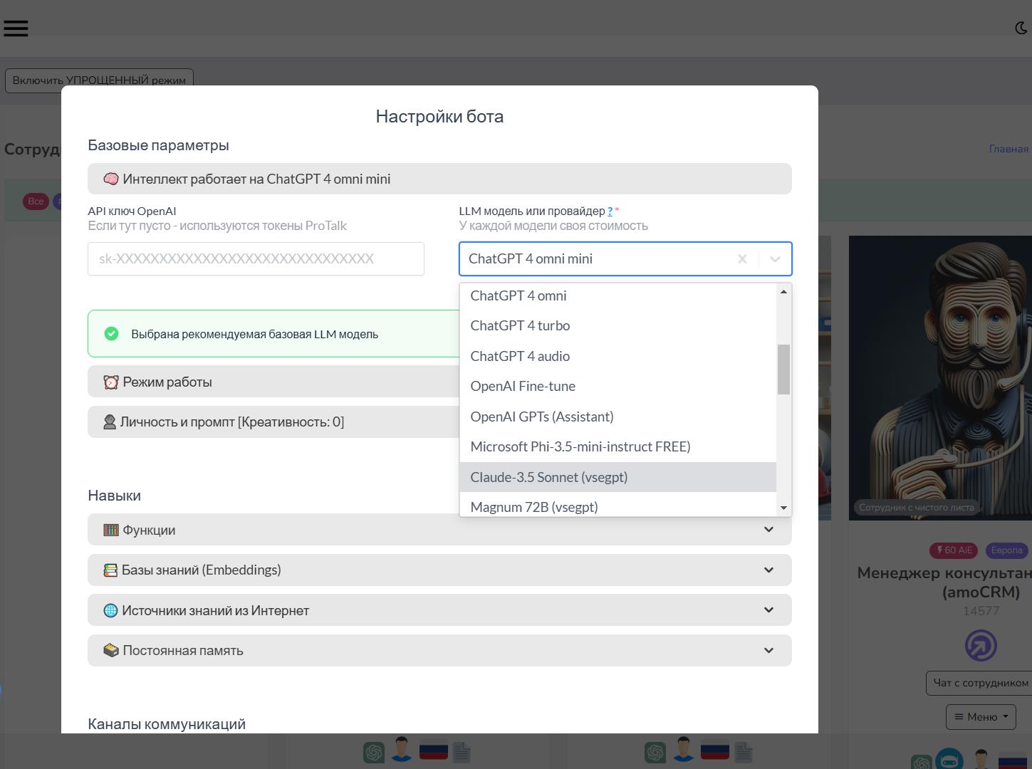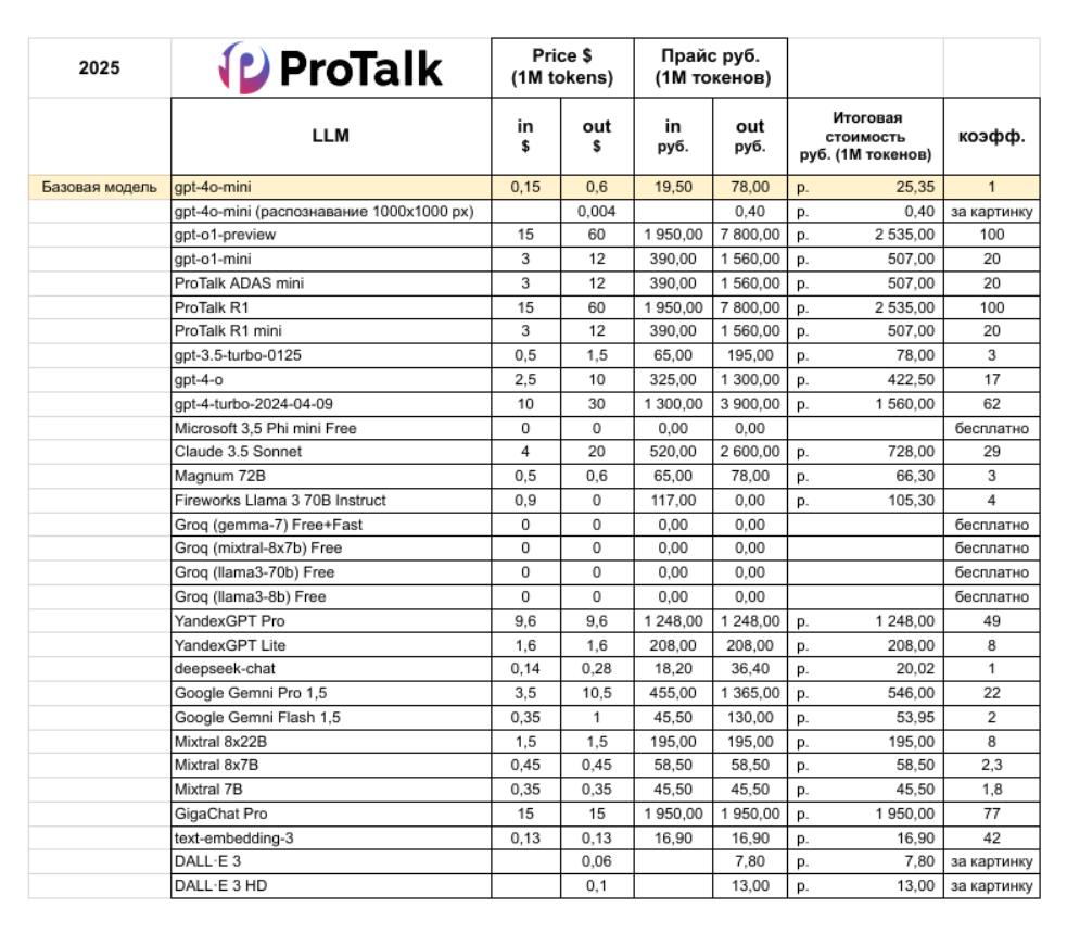 В ProTalk доступно множество платных LLM, которые предлагают более широкий функционал и возможности. Вот некоторые из них:
