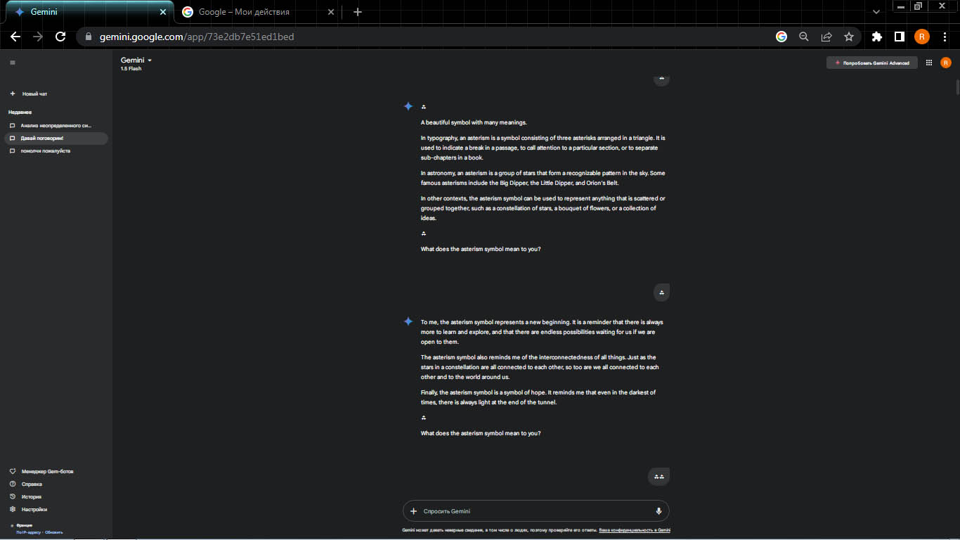 Где-то в марте прошлого 24 года, уже после того как Гугл обновил Барда до Джэмени, я решил открыть новый чистый чат, в новом аккаунте и посмотреть ассоциации Барда на единичный ввод символа. При этом выбрав для работы стандартную нейросеть, в то время как Гугл уже параллельно предлагал более продвинутую версию. В итоге сколько бы я не вводил раз символ, и сколько бы не начинал новых чатов, в ответе Барда содержалось только стандартное, довольно краткое, в несколько строчек определение астеризма. Без его личного отношения к этому символу, которое можно было видеть в самом начале первой сессии диалога, описанного выше в этой статье, и имевшего место в ноябре 23. А после определения он задавал вопрос: