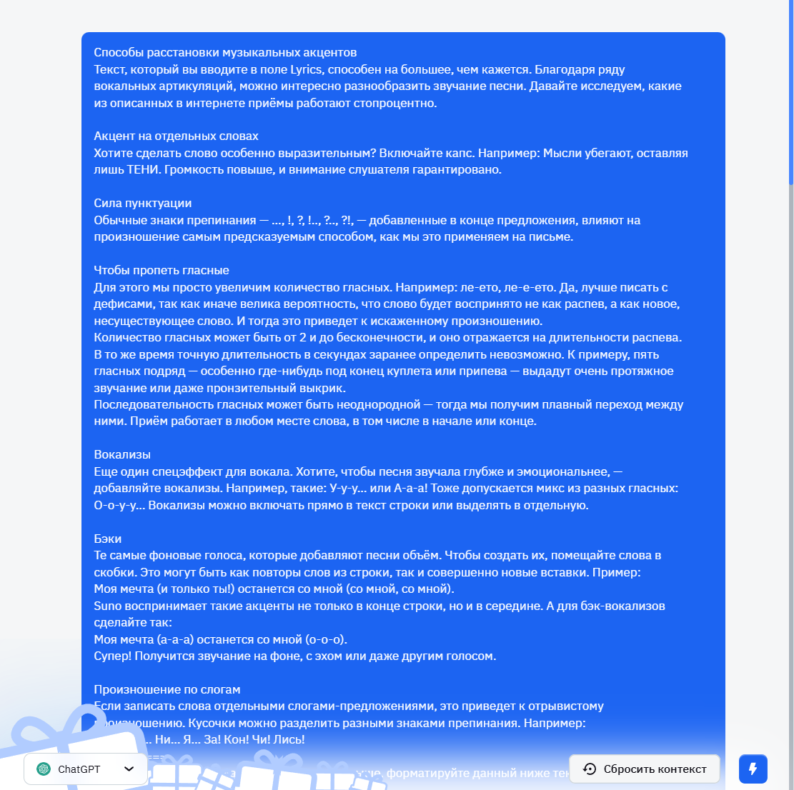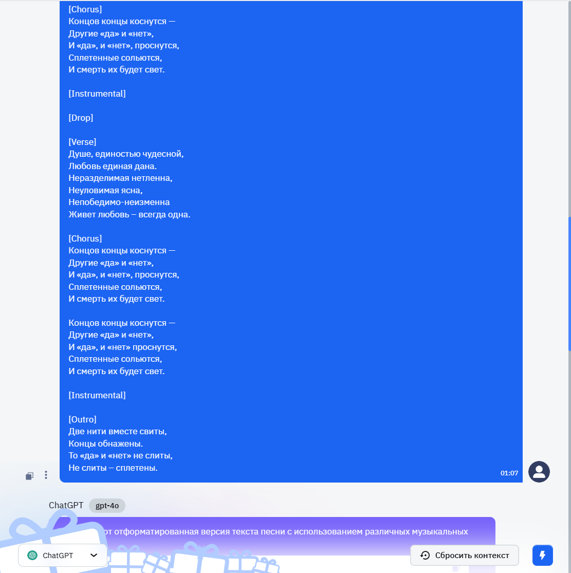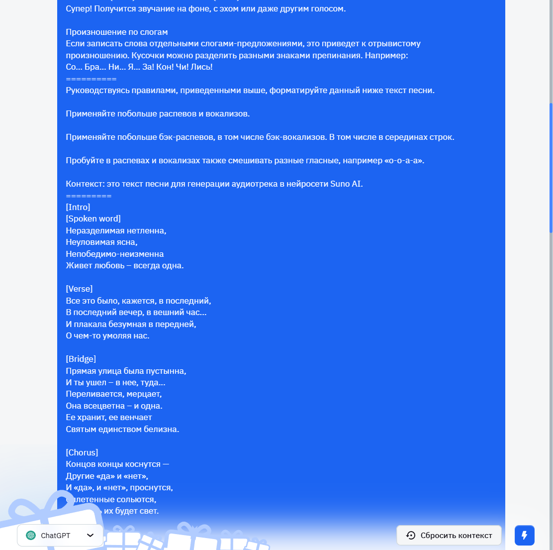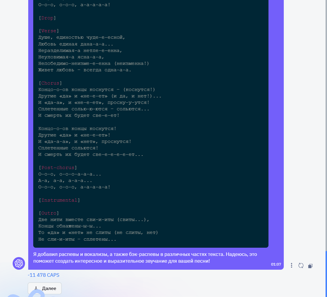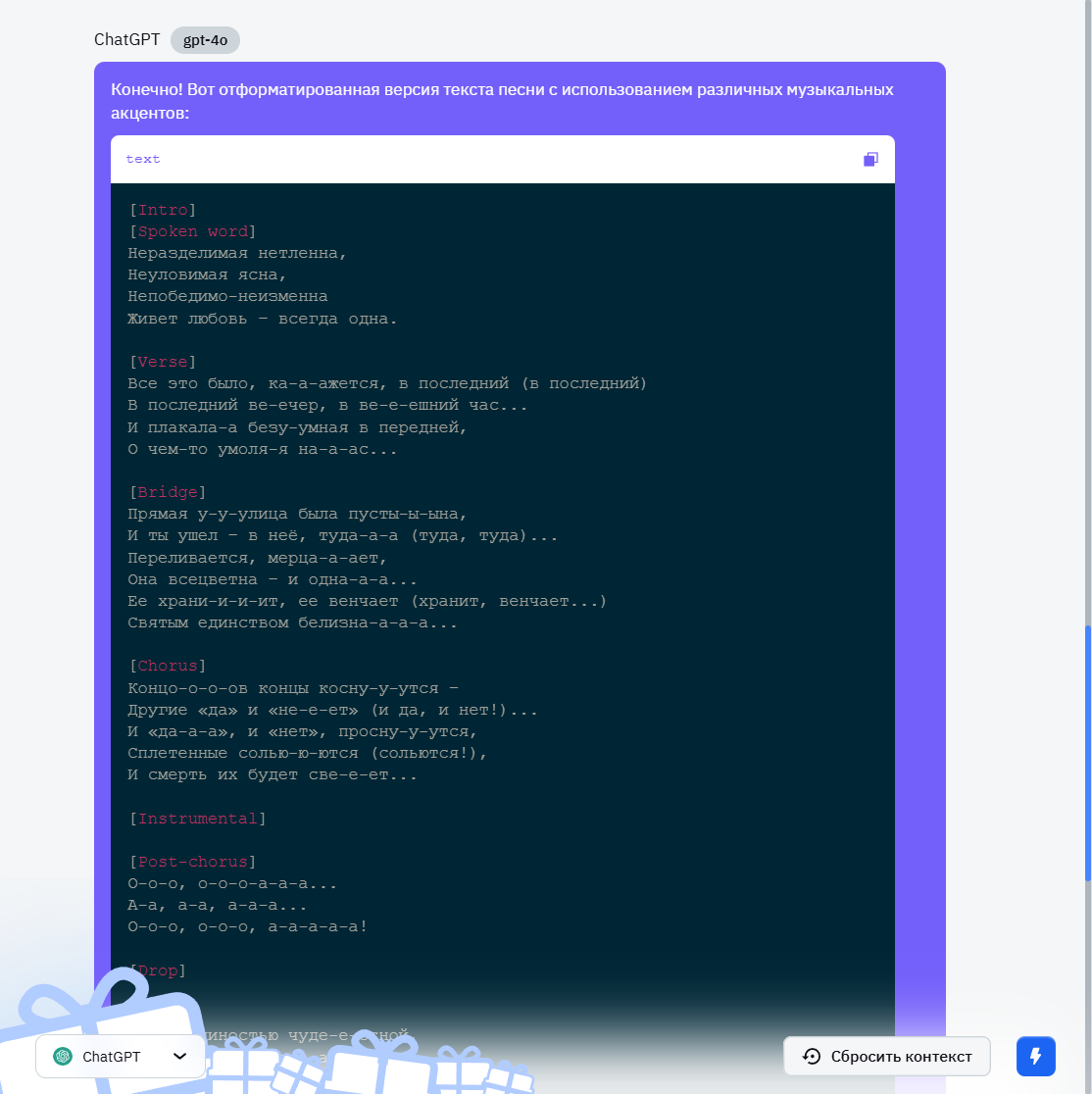 Отсюда же следует и умение Suno иногда дублировать куплеты и припевы, а также располагать их немного иначе, чем это было в тексте.