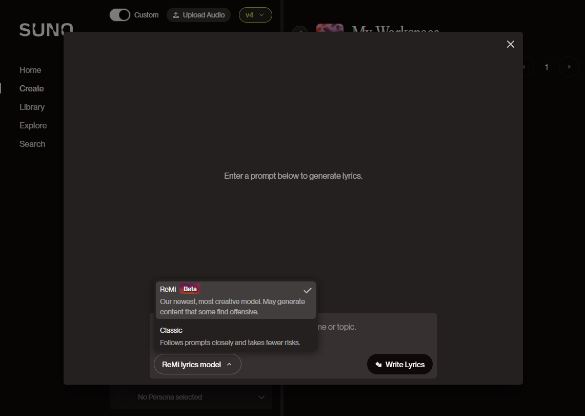 Suno предлагает два текстовых генератора — Classic и ReMi. Лично мне больше по душе эта новая модель, ReMi: она создаёт более глубокие и эмоциональные тексты. Но будьте готовы, что иногда там могут мелькнуть ненормативные выражения.
