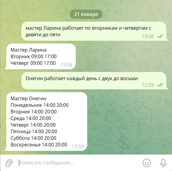 Где визуализация расписания по всем мастерам? А она не нужна. Не нужна администратору, который принимает заказы, потому что не нужен сам администратор на приеме. Не нужна она и клиенту. Он просто скажет к кому и на какое время он желает записаться, и будет записан. Или не записан, если время занято. В этом случае ему будет предложен альтернативный вариант.