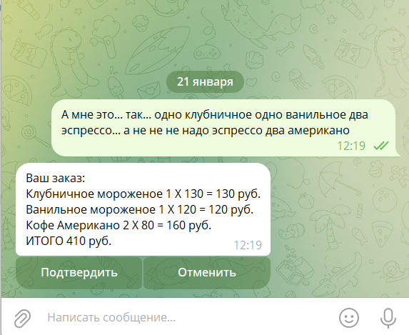Разумеется, то, что написано наверху, в двух строках, произносится голосом. Здесь я даю текстовую расшифровку. Обратите внимание, клиент сделал заказ не напрягая интуицию вообще. Ему не надо было соображать, куда нужно ткнуть в каждый конкретный момент, как добавить еще одну единицу товара, как отменить позицию, где тут кнопка “сделать заказ” и т.д.