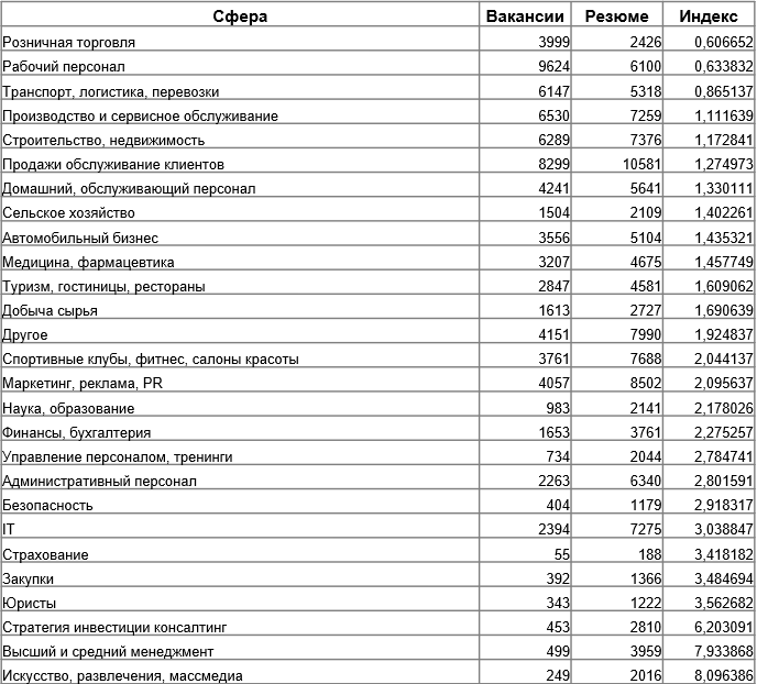 Вот соотношение кандидатов на одну вакансию (колонка “Индекс”) по разным сферам с hh (это Новосибирская область, не спрашивайте почему она).