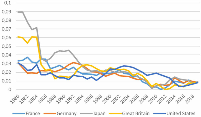 Это конечно очень примерные данные из экономического журнала. Здесь пытались показать на графике снижение темпов роста производительности труда.
