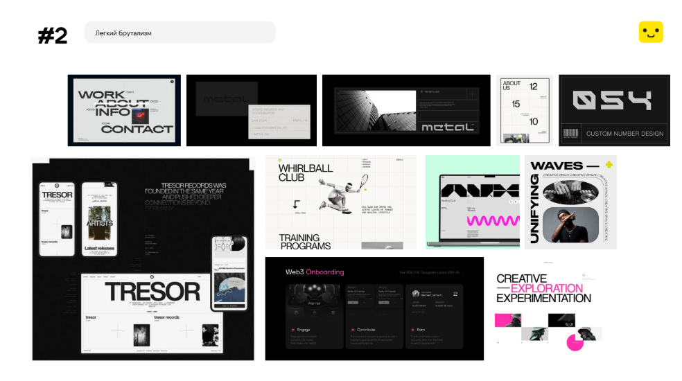 первый сосредоточен на минимализме и легком брутализме, чтобы выделяться на фоне нейросетей бигтеха вроде «Шедеврума» и «Кандинского».