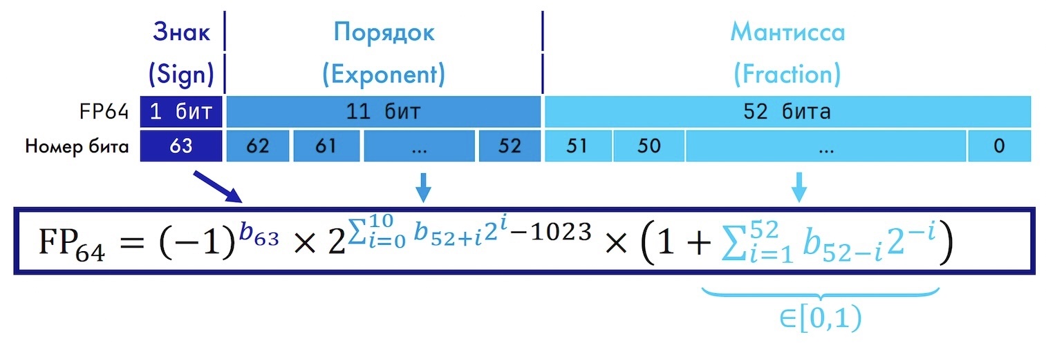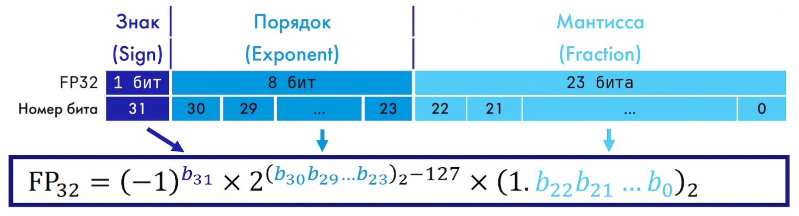 Для начала рассмотрим числа одинарной точности (float, FP32). Для хранения каждого такого числа используется 32 бита: 1 бит отвечает за кодирование знака числа (sign), 8 бит отводится на порядок (exponent) и 23 – на мантиссу (fraction). Пронумеруем биты с нуля справа налево (от мантиссы к знаку) и обозначим их значения (0 или 1) как bi, где i — номер бита. Тогда b31 — знак, (b30b29…b23)2 — порядок, (b22b21…b0)2 — мантисса в двоичной системе счисления, что подчеркивается нижним индексом 2. Значение всего кодируемого числа в десятичной системе счисления рассчитывается по формуле: