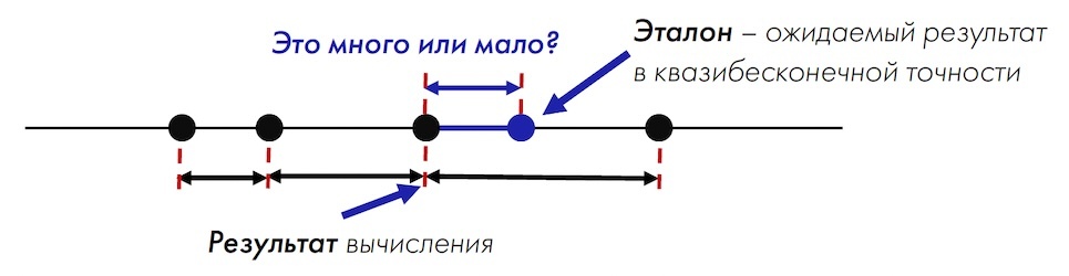 Числа расположены неравномерно, значит, привычная глазу линейка для оценки расстояний между значениями не работает. У нас есть результат вычисления математической функции, число с плавающей точкой, и есть «эталон» — это ожидаемый результат в квазибесконечной точности. Но как понять, насколько велика погрешность вычисления, расстояние между ними?