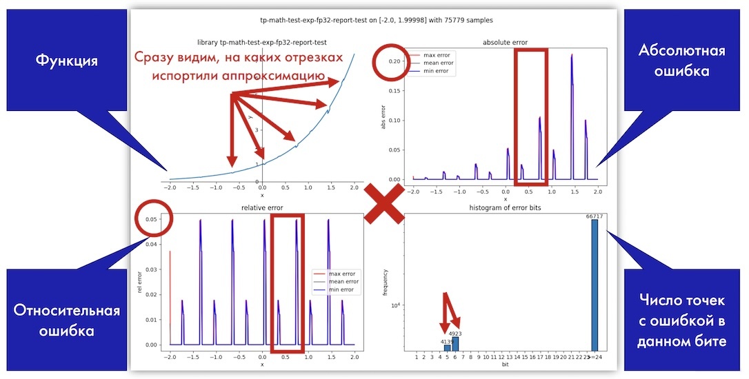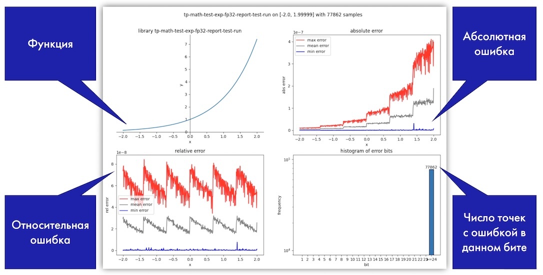 Удобно использовать графическое представление результатов тестирования: для каждой функции строить графики рассчитанных значений, абсолютной ошибки, относительной ошибки и гистограмму распределения ошибок в точках по битам.