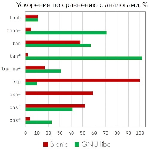 Мы разобрались, как можно построить систему тестирования точности реализаций математических функций без ограничений по фреймворкам так, чтобы в пределе обеспечить стопроцентное покрытие значений тестами. Узнали, какие аппроксимации позволяют строить высокопроизводительные реализации функций libm, удовлетворяющие стандартам точности (0,5 ульпа): на графике ниже показано, какое ускорение позволяют получить минимаксы по сравнению с реализациями из glibc и AOSP Bionic.