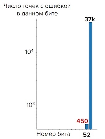 Возьмем примерно 37 500 точек, 64-битных чисел (double), вычислим в них tanh при помощи glibc и построим гистограмму точности: для каждого бита отметим, в скольких точках в нем содержится ошибка в вычисленном значении. Получаем, что уже в 52-м бите возникает ошибка в 450 точках, а начиная с 53-го бита ошибка есть во всех остальных. Это явно не соответствует стандартам точности libm.