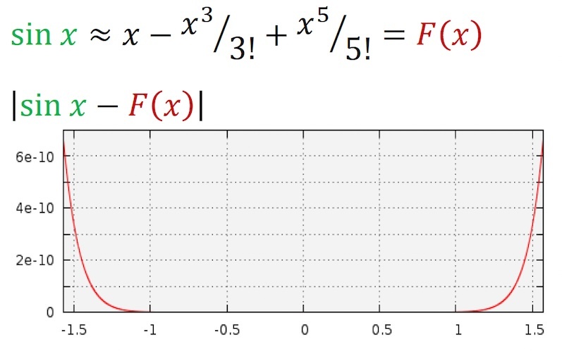 Понятно, что нужно взять больше членов. Построим, например, ряд Тейлора до пятого порядка. На графике это красная линия F(х). Видно, что синус она приближает явно лучше, чем просто линейная функция, но с некоторого значения аргумента мы невооруженным глазом все равно видим расхождение красной и зеленой линий, то есть ошибку аппроксимации.