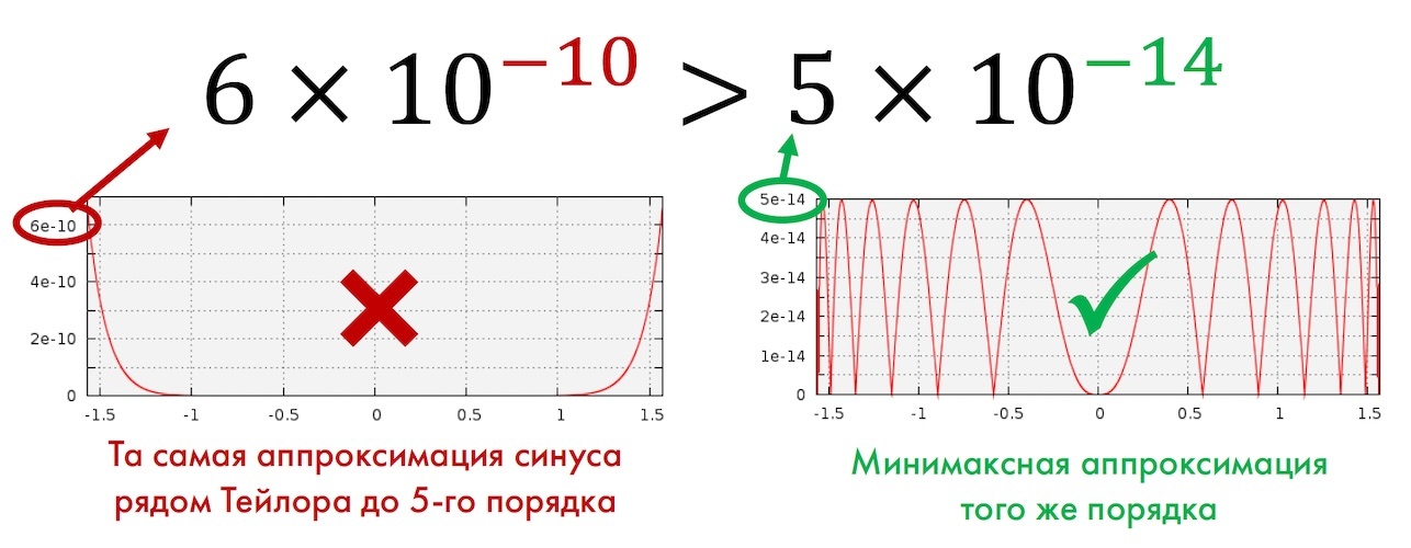Что лучше использовать? Не буду углубляться в теорию, а сразу раскрою оптимальный способ — минимаксная аппроксимация. Один полином от другого может отличаться только коэффициентами, и при минимаксной аппроксимации коэффициенты выбираются так, чтобы минимизировать максимальную абсолютную погрешность на всем интервале аппроксимации. Для этого нам даже не нужно ставить оптимизационные задачи и решать их. Алгоритм расчета коэффициентов минимаксной аппроксимации давно придуман — большое спасибо Чебышёву, Паде, Ремезу и другим классикам теории аппроксимации.