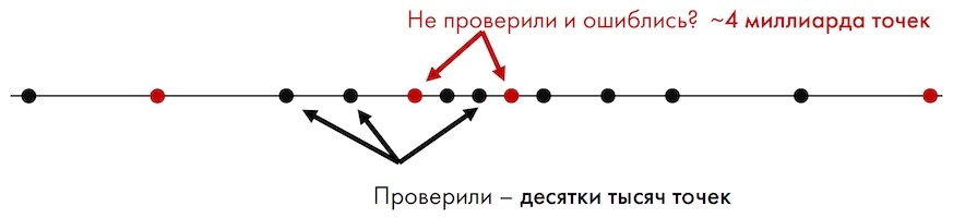 Распространенный способ тестирования точности libm — это сверка результата вычислений с эталонными значениями для предопределенного набора входных данных. Такой набор обычно состоит из нескольких десятков тысяч точек. Но если мы говорим о 32-битных числах с плавающей точкой (float), то их уже более 4 миллиардов. То есть при сверке проверяется порядка 0,001% всех точек. Вероятность того, что мы ошибаемся где-то между ними, мягко говоря, ненулевая.