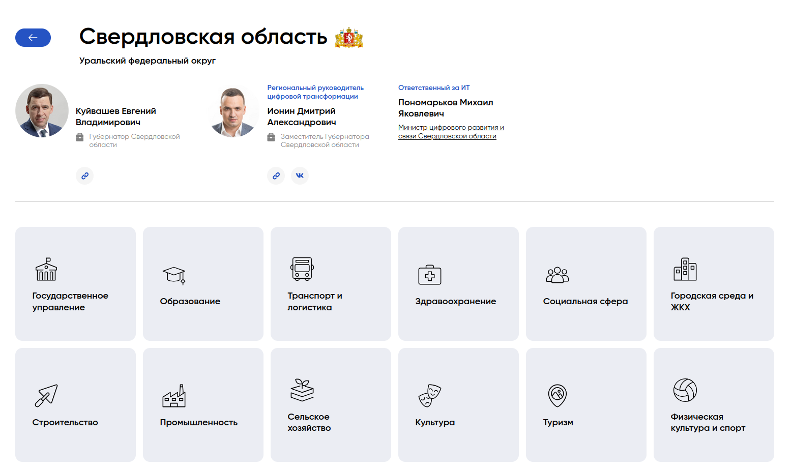 В настоящее время на сайте проекта собраны данные о руководителях цифровой трансформацией (РЦТ) в субъектах РФ, а также лицах, ответственных за внедрение ИТ и технологий искусственного интеллекта [2] (ИИ), региональных отраслевых РЦТ и подведомственных учреждениях. Там также даны ссылки на ресурсы соответствующих министерств и ведомств в регионах (РОИВ).