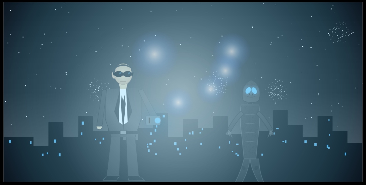 Полученный код изображает агента в черном и пришельца с миндалевидными глазами на фоне ночного города, в небе которого двигаются стилизованные туманности и галактики. Агент нажимает периодически кнопку на нейрализаторе, происходит знаменитая зелёная вспышка, которая эффектными бликами отражается в больших глазах пришельца и окнах домов ночного города. После чего пришелец впадает в транс и безвольно циклически двигается из стороны в сторону.
