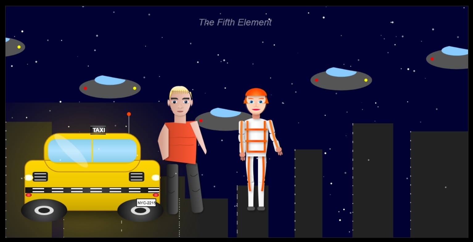 Напиши HTML-код, который рисует Корбена Далласа и Лилу из фильма «Пятый элемент» на canvas размером 1200×600 пикселей. Рисунок создается программно с использованием только нативного JavaScript и Canvas, без внешних библиотек и изображений.