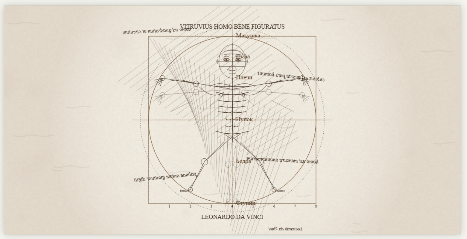Модель подошла творчески и решила поглубже войти в образ и в коде применила такие нюансы, как «эффект выцветания по краям», «небольшие трещины пергамента», а также знаменитые высказывания на латыни типа «homo ad quadratum et circulum», но справа налево, как иногда делал сам Леонардо.