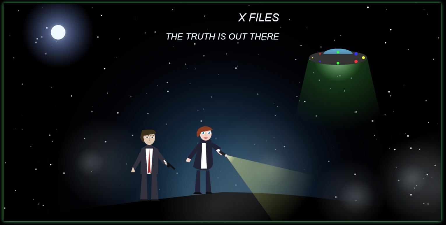 Полученный код изображает агентов Малдера и Скалли на фоне звездного неба, по которому проплывает красивая летающая тарелка. Малдер держит в руке пистолет, а Скалли светит фонариком в разные стороны.