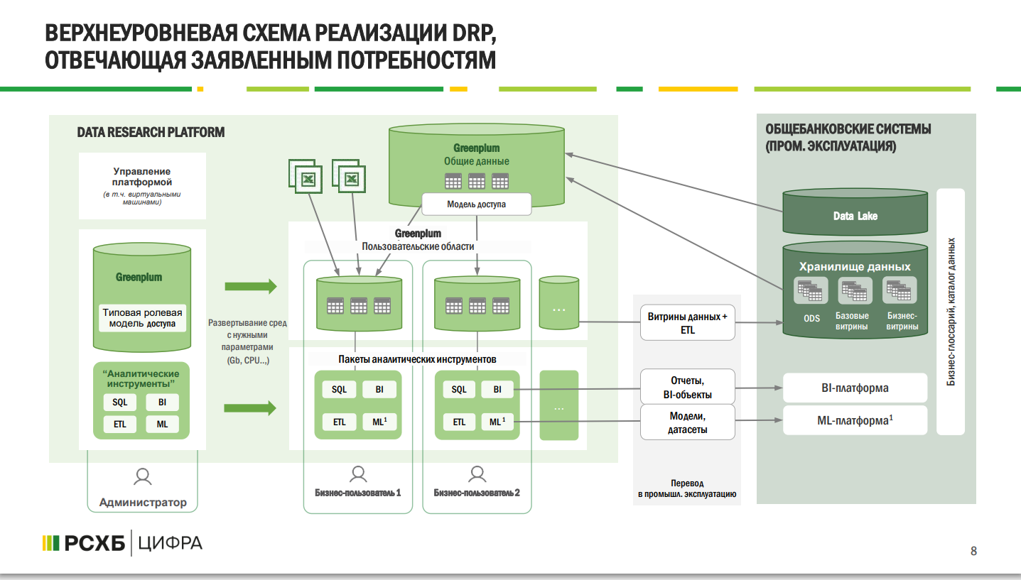 Как мы влились в аналитический контур РСХБ в целом? DRP-песочница заняла место рядом с Озером данных и хранилищем. Сейчас мы загружаем в DRP базовый слой и почти весь бизнес-слой хранилища данных, из Озера забираем точечно витрины для определенных задач. В планах интеграция с ODS слоем КХД.