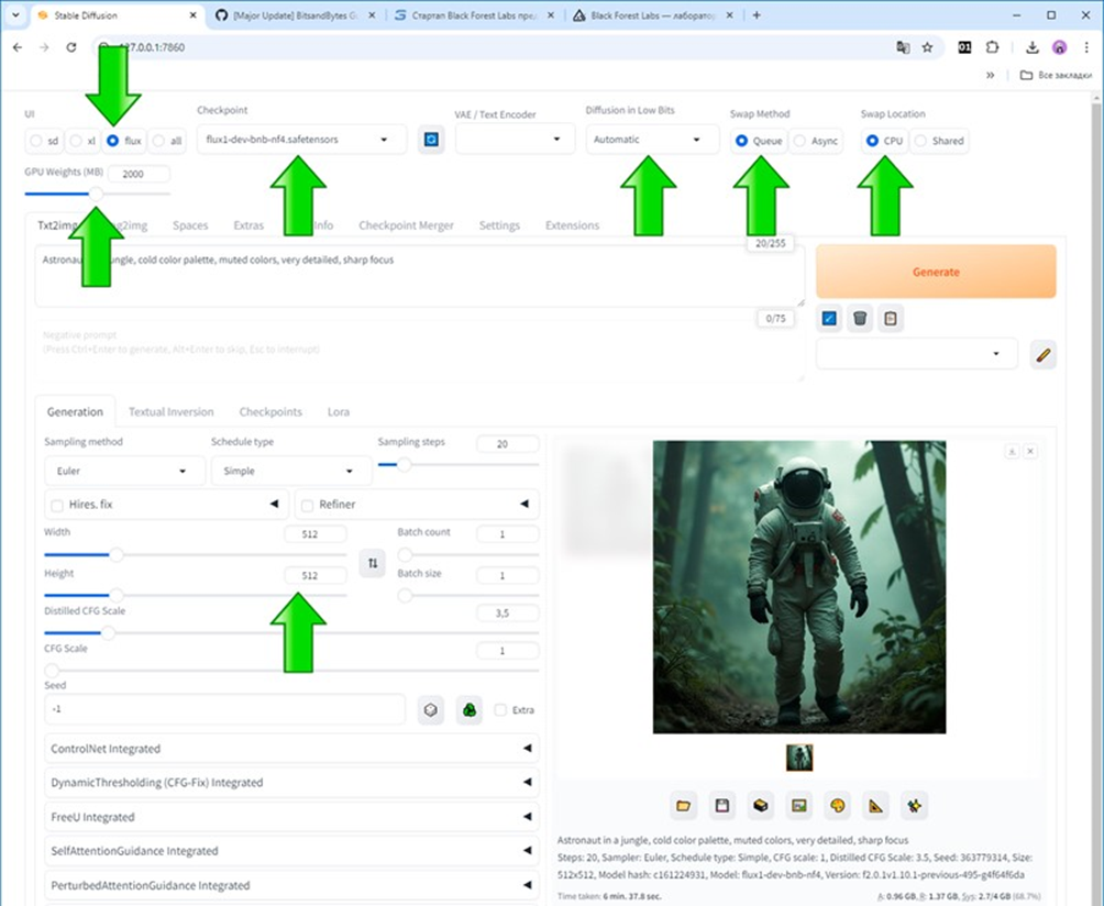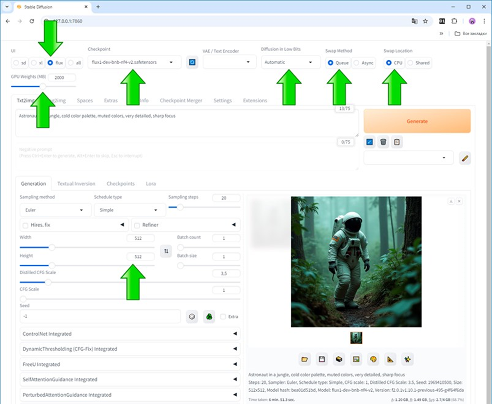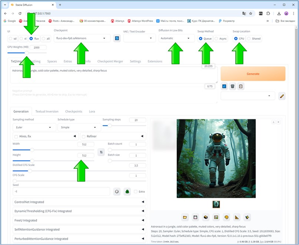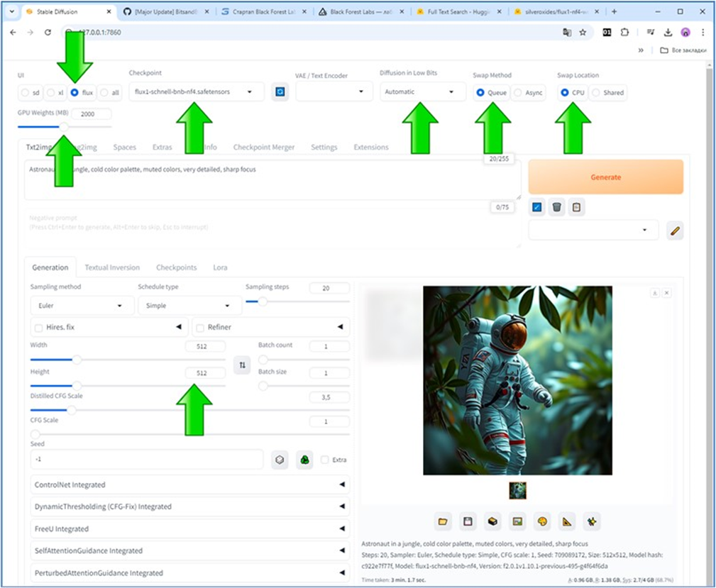 В заключение хочется отметить, что система генеративного искусственного интеллекта Stable Diffusion WebUI Forge и модель FLUX.1 требуют от нас использования значительных вычислительных ресурсов, которые нужно умело настроить и использовать.