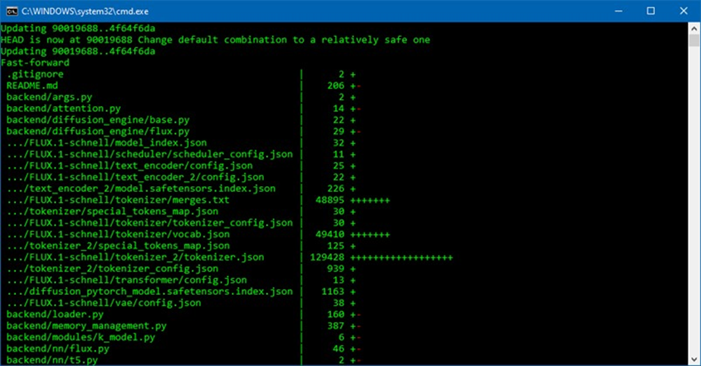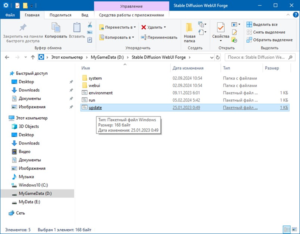 Давайте возьмем для себя за первое правило всегда запускать перед работой файл update.bat. Да, именно он позволит нам всегда использовать самую последнюю версию нашей сборки Stable Diffusion WebUI Forge.