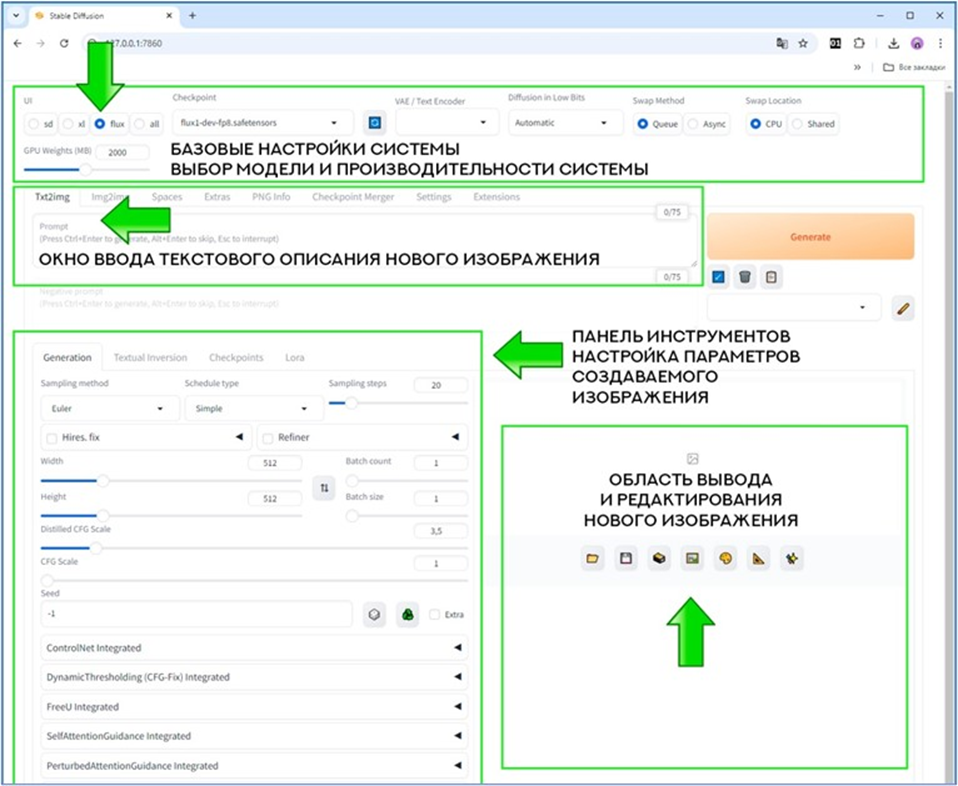 2. Второе окно, которое откроется в вашем интернет-браузере, – это окно пользовательского интерфейса программы Stable Diffusion WebUI Forge на английском языке.