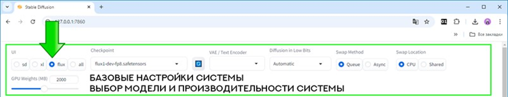 UI (пользовательский интерфейс) – это настройка предустановок (пресетов) пользовательского интерфейса, которая включает несколько опций выбора: sd; xl, flux и all. Как вы можете догадаться из их наименований, в зависимости от того, какую модель вы будете использовать, изменится вид пользовательского интерфейса и панели инструментов. Я рекомендую выбрать flux, так как это наша основная модель, которой мы посвятим 100 % своего времени.