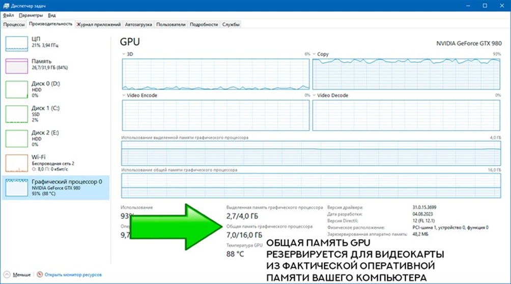 Если мы выберем метод Shared (который работает несколько быстрее), то часть модели будет загружена в оперативную память GPU, а оставшаяся часть будет размещена в виртуальной оперативной памяти (или общей памяти GPU), которая резервируется для видеокарты из фактической оперативной памяти вашего компьютера.