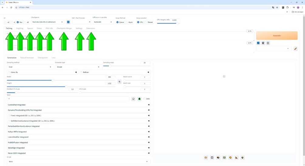 Под меню выбора модели и базовых настроек находятся восемь закладок, каждая из которых дает доступ к различным функциональным интерфейсам программы Stable Diffusion WebUI Forge.