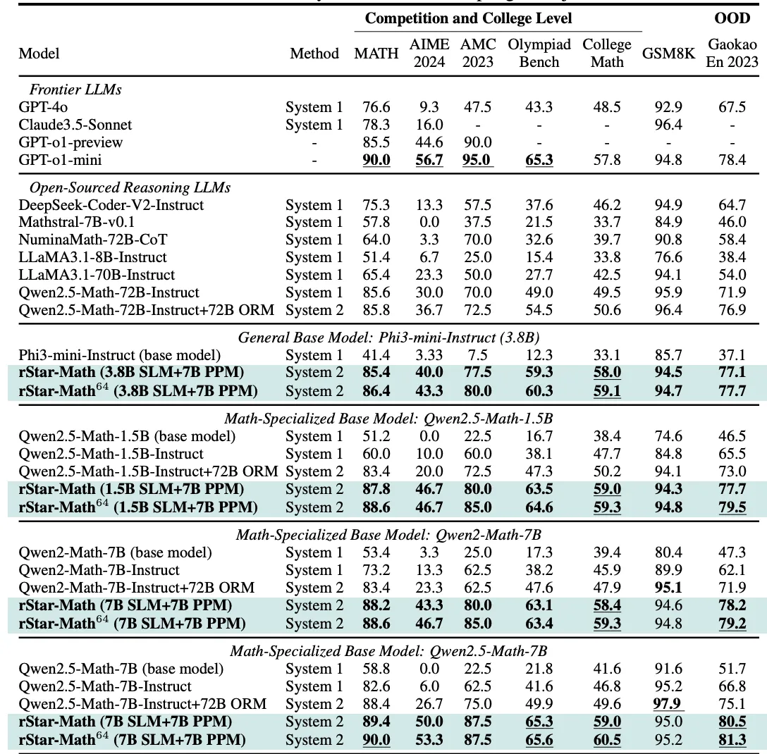 rStar-Math от Microsoft (лучшая статья недели по вопросно-ответным системам на AImodels.fyi) меняет эту парадигму благодаря трём связанным инновациям: программная верификация каждого шага рассуждений, модель предпочтений, которая учится оценивать промежуточные размышления, и многоэтапный процесс саморазвития. Их модель с 7 миллиардами параметров — используя эти методы — не уступает или даже превосходит модели, которые больше в 100 раз.