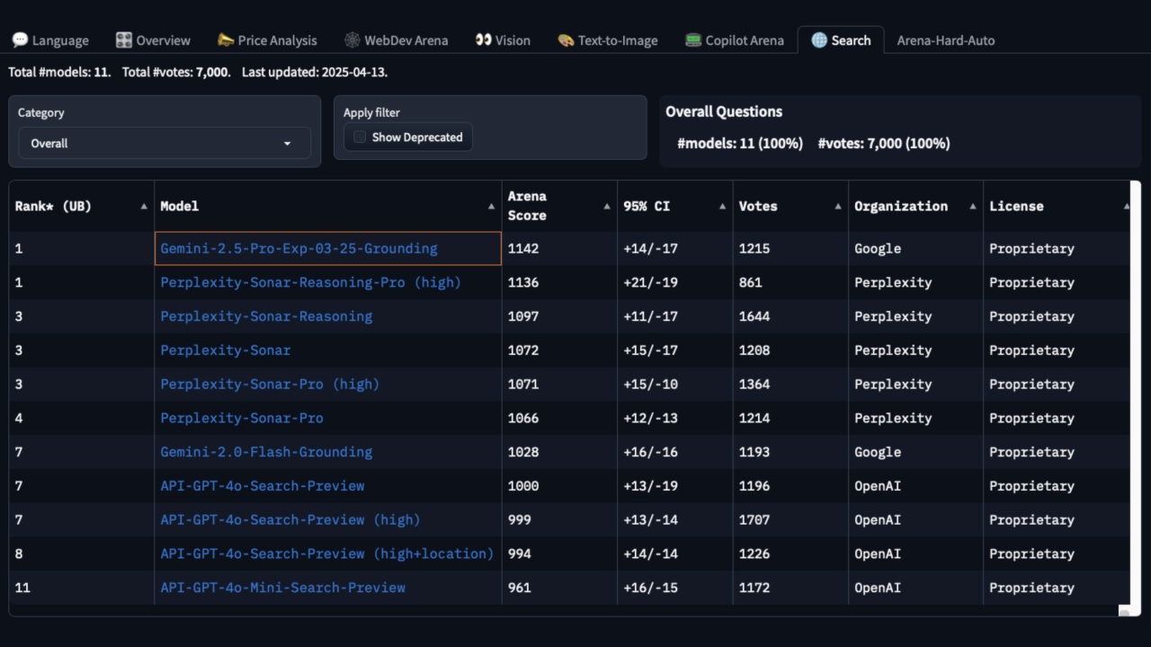 Разработчики lmarena выпустили Search Arena — рейтинг нейросетевых поисковиков. Исследователи проанализировала более 7 тыс. пользовательских оценок и нашли лидера — языковую модель Gemini-2.5-Pro-Exp-03-25-Grounding от Google. Нейросеть от OpenAI занимает седьмое место в списке.