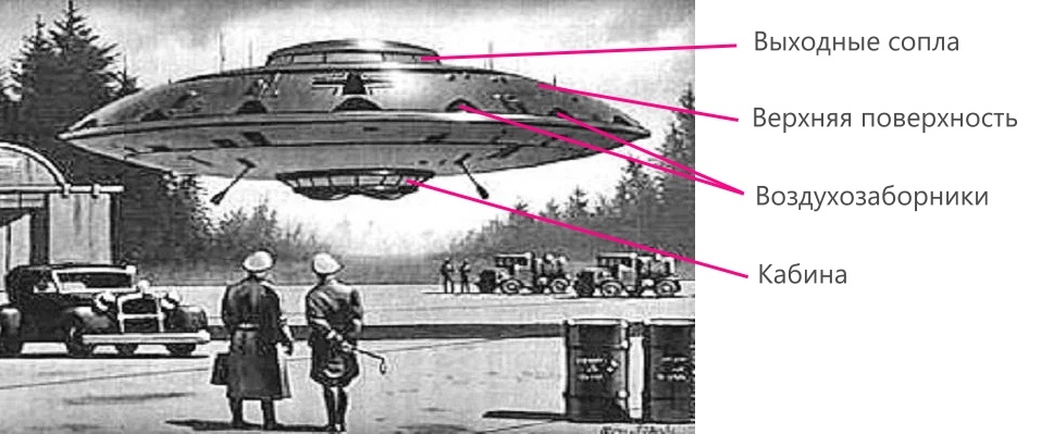 Начнём с того, что в сороковых годах в Германии появилась информация о разработке летающих тарелок, включающая в себя чертежи и фотографии. Давать подробную справку по этой теме не будем, так как её легко найти в интернете, в частности, в Википедии. Не вдаваясь в дискуссию о том, насколько реальны эти фотографии, возьмём одну из наиболее известных из них и попытаемся представить на каких научно-технических принципах могло летать такое устройство.