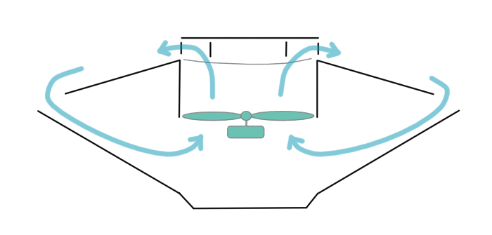 Интересно, что поток воздуха в такой тарелке движется по циклу и формирует структуру похожую на кольцевой тороидальный вихрь, как на рис.5, где зеленым изображён пропеллер с двигателем, а стрелки показывают направления кольцевых потоков вихря.