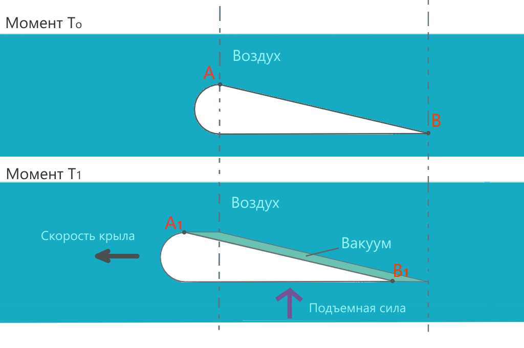 Рассмотрим, что, на наш взгляд, может являться реальной причиной возникновения подъёмной силы крыла, профиль которого схематично изображен на рисунке 1. Для наглядности специально изобразил профиль толще чем обычно. Слева, на передней кромке, округлое обтекаемое утолщение, нижняя поверхность – горизонтальная, а верхняя идет под наклоном вниз до соединения с нижней. Крыло движется справа налево в статичном окружающем воздухе, который изображен голубым цветом. Представим, что на верхней половине рисунка, обозначенной как Момент Т0,  крыло неподвижно относительно окружающего воздуха. Тогда давление воздуха на его верхнюю и нижнюю поверхности практически одинаково. Представим далее, что крыло стало с большой скоростью двигаться влево, так что точки А и B на его верхней поверхности перемещаются в точки А1 и B1, как на нижней части рисунка, (Момент Т1).