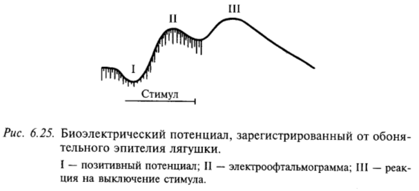Молекулы запахового вещества контактируют с обонятельной слизистой оболочкой. Предполагают, что приемником запаховых молекул являются макромолекулы белка, которые меняют свою конформацию при присоединении к ним запаховых молекул. При действии пахучих веществ на обонятельный эпителий от него регистрируется многокомпонентный электрический потенциал. Электрические процессы в обонятельной слизистой оболочке можно разделить на медленные потенциалы, отражающие возбуждение [7] рецепторной мембраны, и быструю (спайковую) активность, принадлежащую одиночным рецепторам и их аксонам [8]. Медленный суммарный потенциал включает три компонента: позитивный потенциал, отрицательный потенциал на включение (его называют электроофтальмограммой, ЭОГ) и отрицательный потенциал на выключение (рис. 6.25). Большинство исследователей считают, что ЭОГ является генераторным потенциалом обонятельных рецепторов.