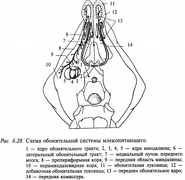 Структура и функция центрального отдела обонятельного анализатора [14]. Волокна латерального обонятельного тракта оканчиваются в различных отделах переднего мозга: в переднем обонятельном ядре, латеральной части обонятельного бугорка, препирифор-мной и периамигдалярной областях коры, а также в прилегающей к ней кортико-медиальной части миндалевидного комплекса, включая ядро латерального обонятельного тракта, в которое, как полагают, приходят также волокна из добавочной обонятельной луковицы (рис. 6.28). Связи обонятельной луковицы с гиппокампом [15], энторинальной областью пириформной коры и другими отделами обонятельного мозга у млекопитающих осуществляются через одно или несколько переключений. От первичной обонятельной коры нервные волокна направляются к медиовентральному ядру таламуса [16], к которому имеется также прямой вход от вкусовой системы. Волокна медиовентрального ядра таламуса, в свою очередь, направляются к фронтальной области новой коры, которая рассматривается как высший интегративный центр обонятельной системы. Волокна от препириформной коры и обонятельного бугорка идут в каудальном направлении, входя в состав медиального пучка переднего мозга. Окончания волокон этого пучка обнаруживаются в латеральном преоптическом ядре, в латеральной области гипоталамуса, периинфундибулярном ядре и двойном ядре (nucleus ambiguus) гипоталамуса. Из описания этих связей становится понятной тесная связь обоняния с пищевым и половым поведением [17] млекопитающих. На основании некоторых психофизиологических наблюдений восприятия [18] запахов человеком выделяют 7 первичных запахов: мускусный, камфарный, цветочный, эфирный, мятный, острый и гнилостный.